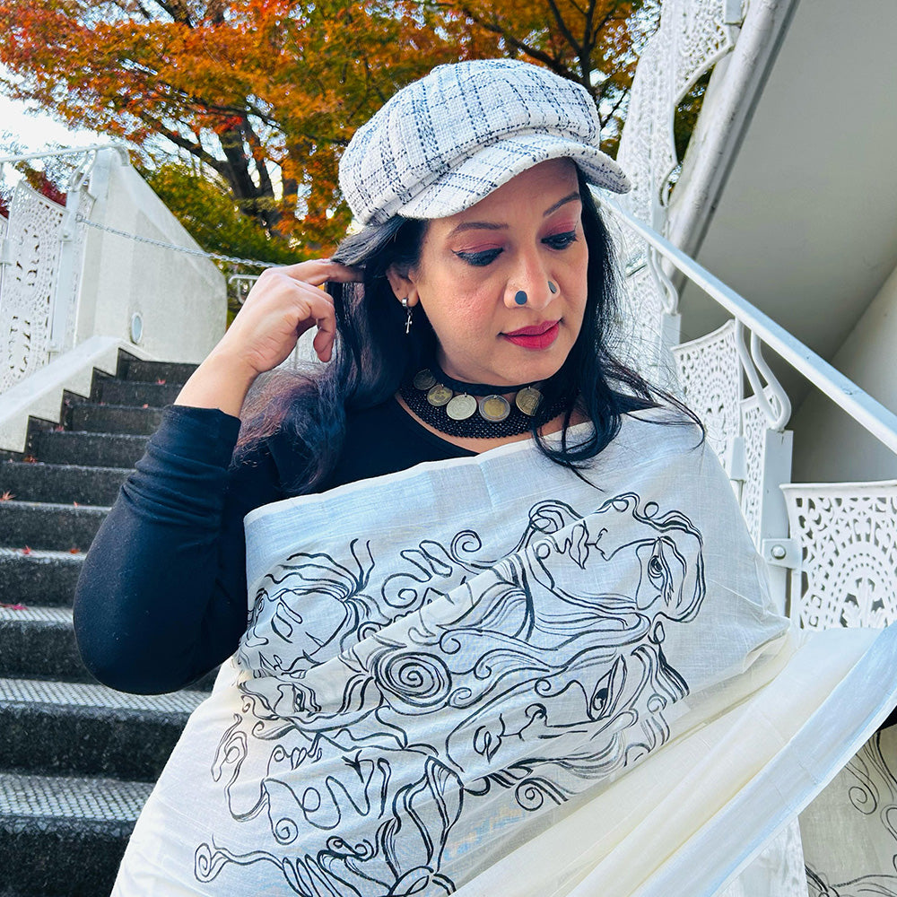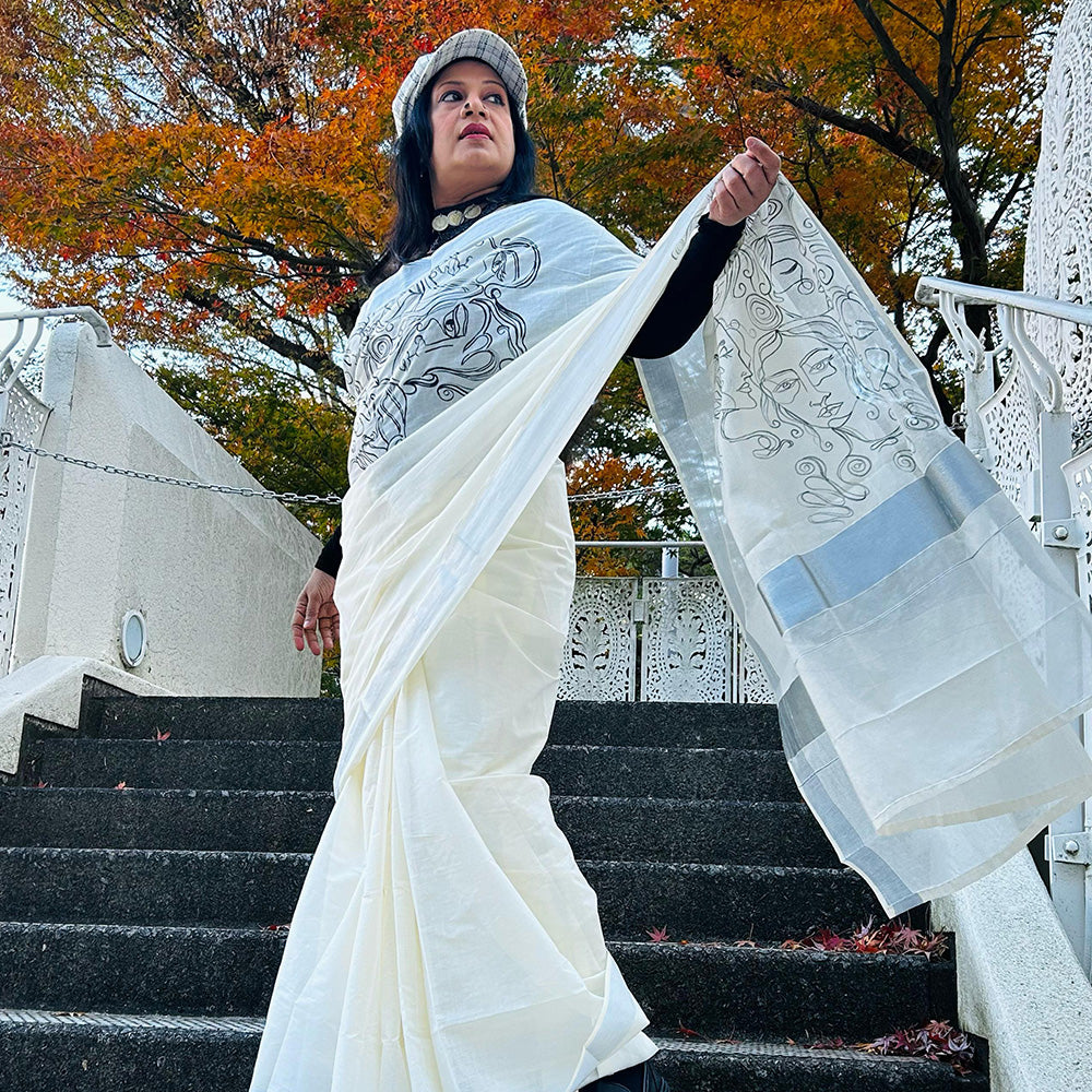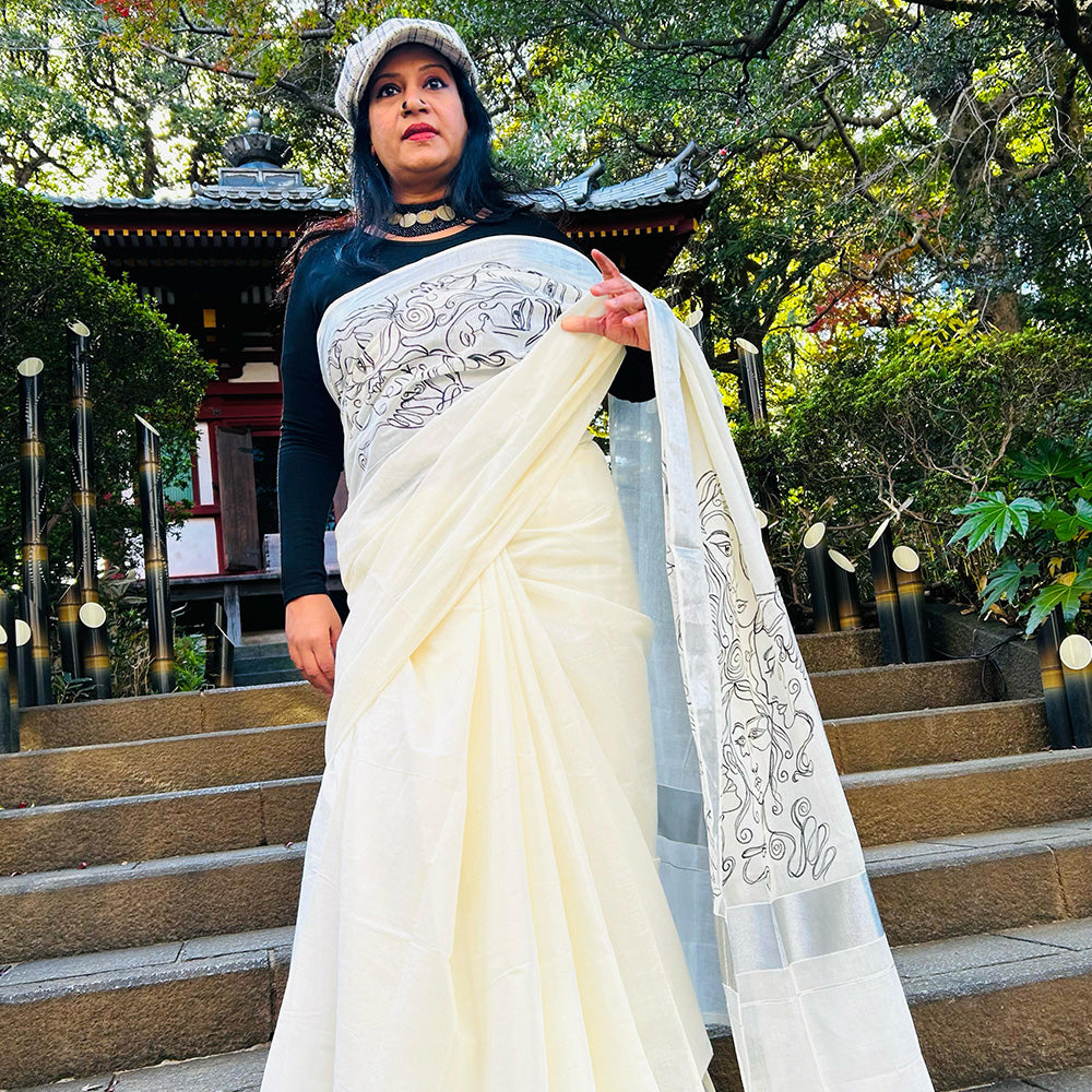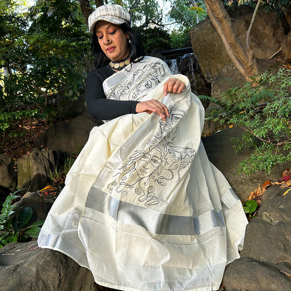 Faces Line Drawing Design Saree